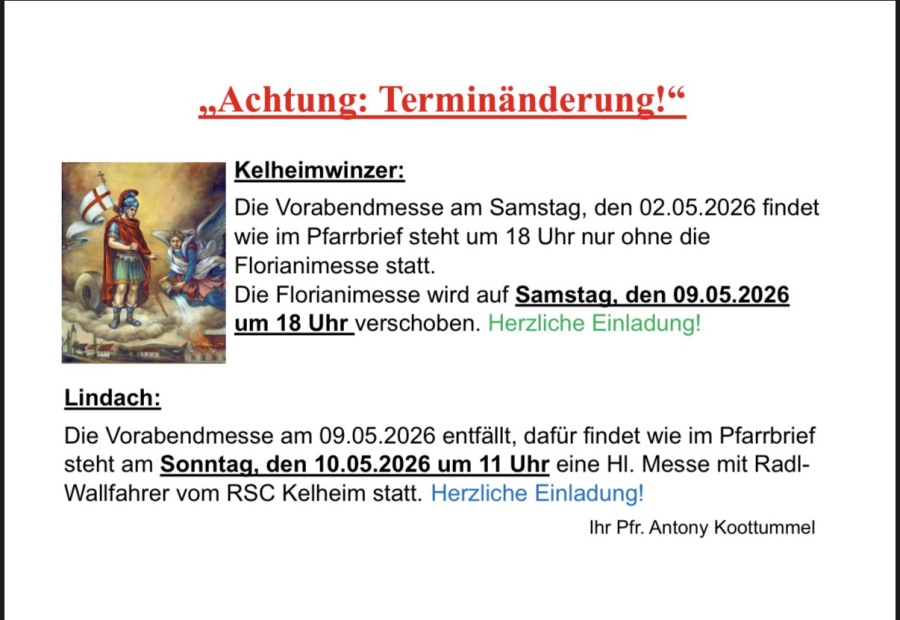 Der Termin für die Firmung steht fest, sie findet am Mittwoch, den 17.06.2026 um 10 Uhr in der Stadtpfarrkirche Kelheim statt. Der Firmspender wird Domkapitular Msgr. Martin Priller sein.