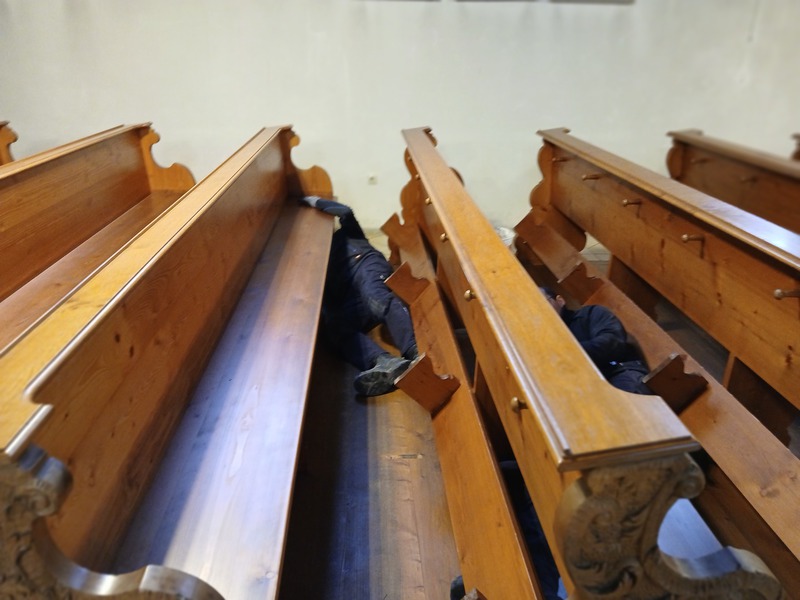 Als erstes entfernten die Elektriker die veraltete Sitzheizung unter den Bänken.
